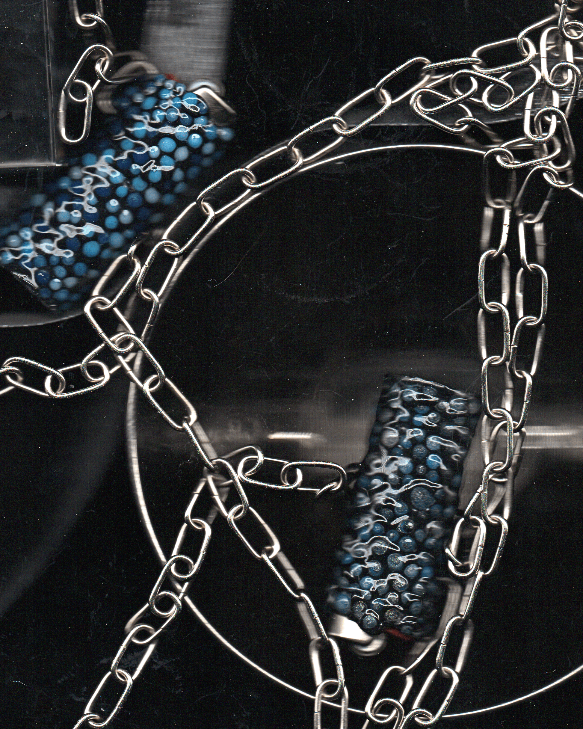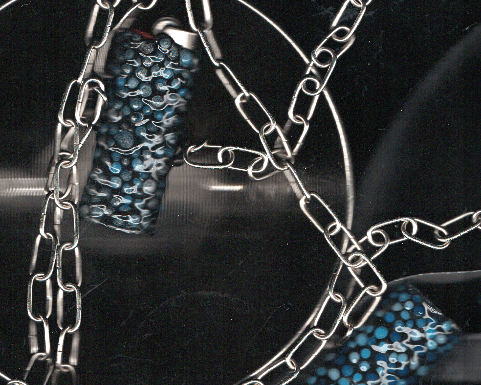 Black base with glittery mixed blues, silver and black.